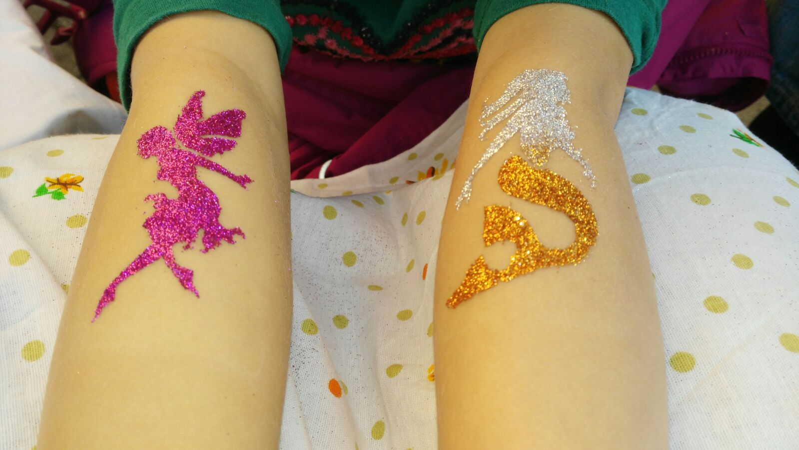 Glitzer-Tattoo's sind eine Attraktion, mit der Sie Kinder, Jugendliche und auch Erwachsene begeistern können. Feen, Blumen, Drachen, Tribals, Schmetterlinge, Delphine die Auswahl der Motive ist groß.